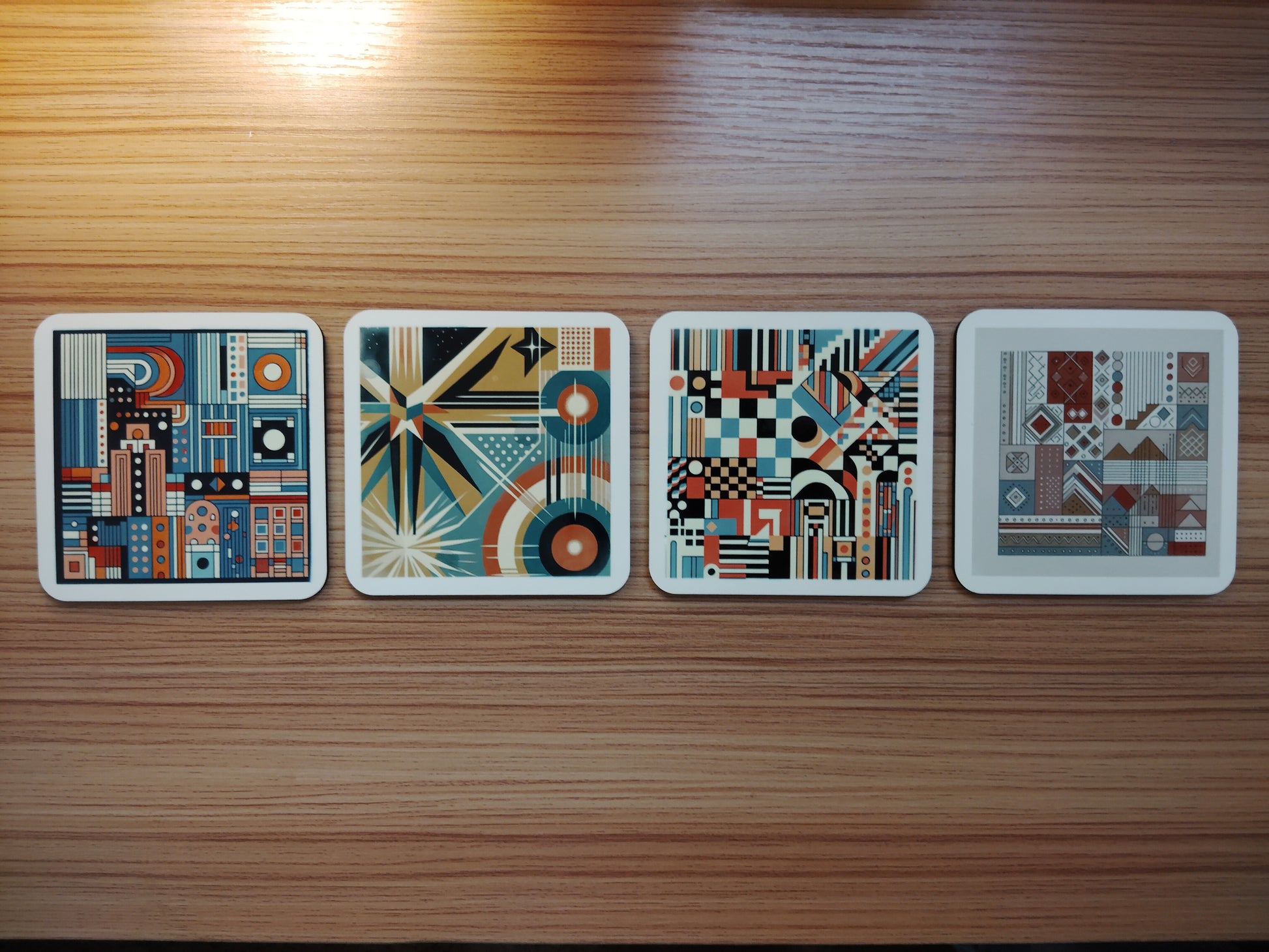 Mind Maze Night, Daytime, Transverse Light, And Earth Tone Geometry are included in this set of 4 coasters.
